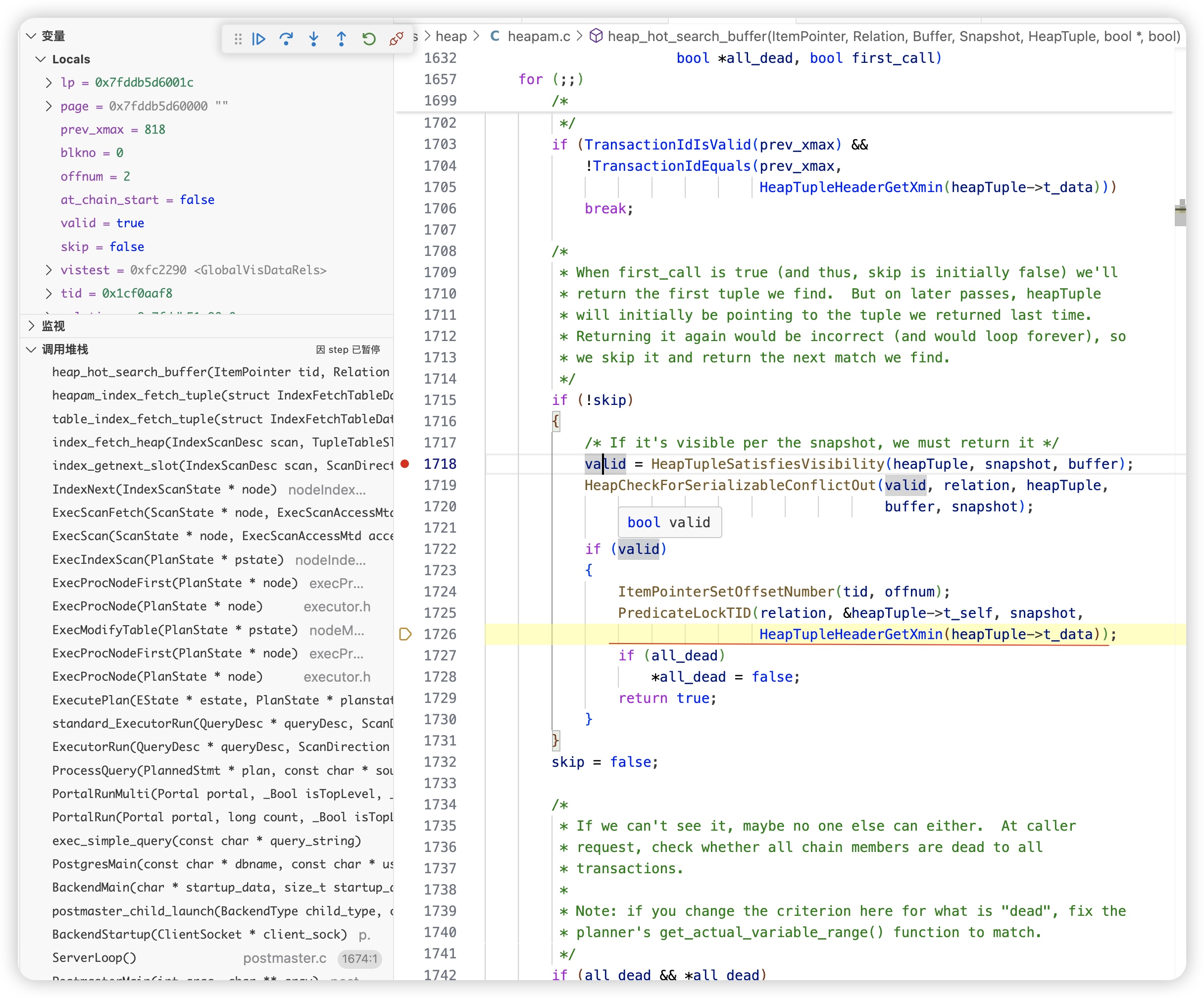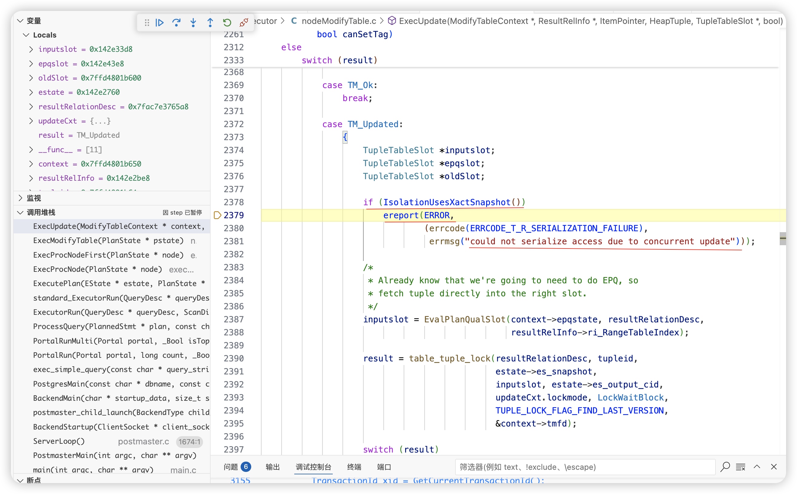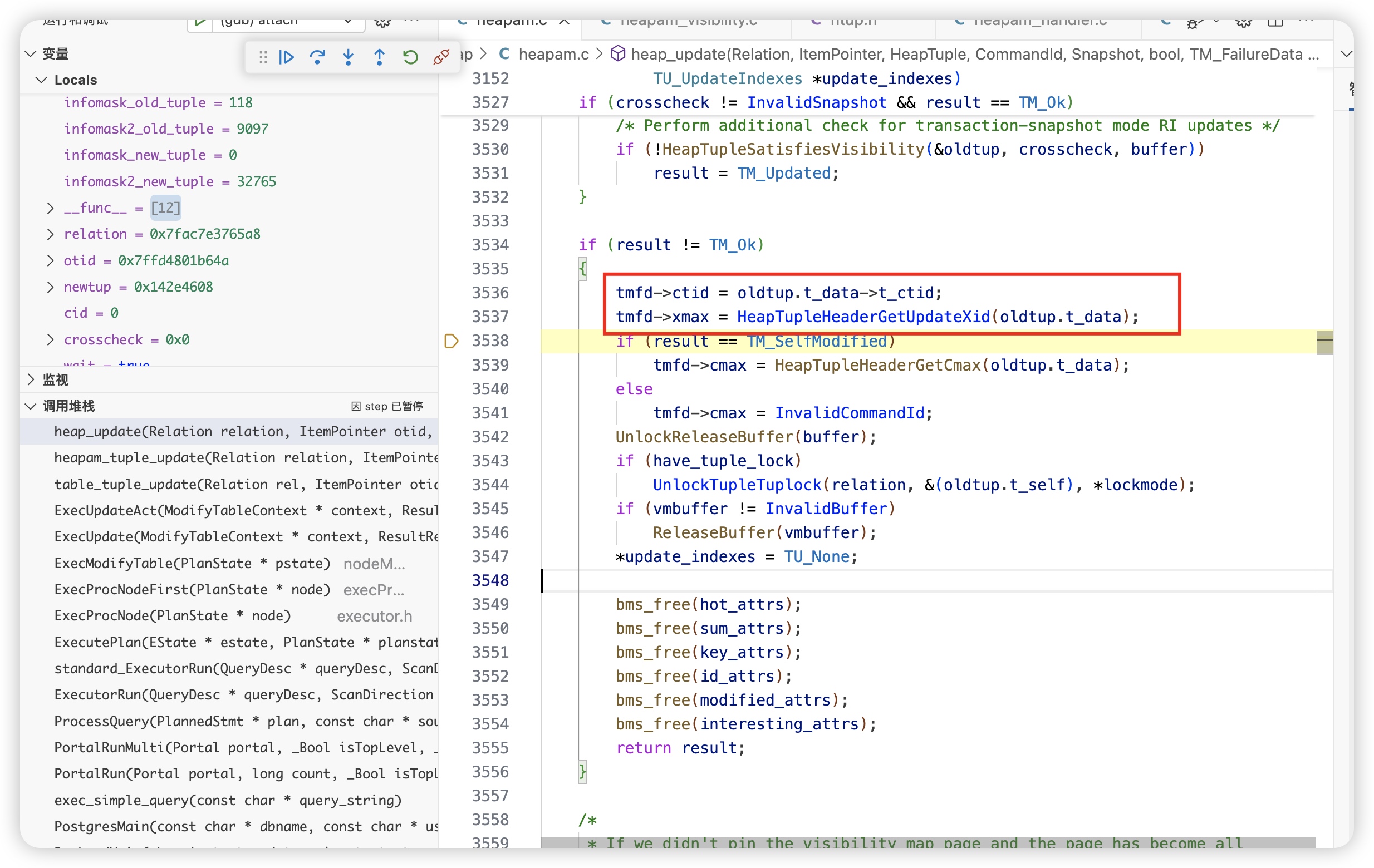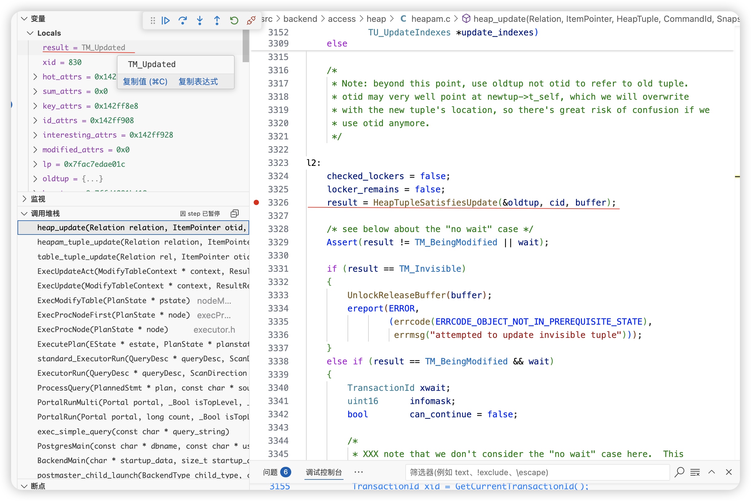 在heap_update 函数中,通过HeapTupleSatisfiesUpdate检测到该数据已经被其他事务修改了,result=TM_Updated,正常update成功的话,result=TM_Ok